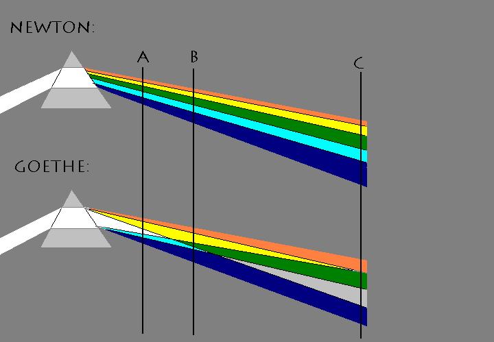 “The phenomenon is not the same everywhere behind the prism. It shows always new relations, depending on the distance of the screen on which the colours display. If you see this point, the mistake of Newton`s whole theory is clear. The teacher and the successors performed their most important experiment totaly wrong.”